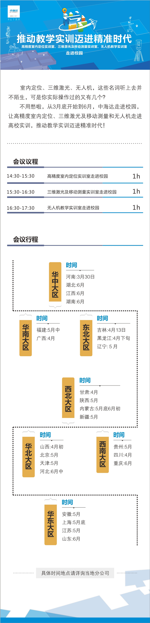 从3月底开始到6月,中海达走进校园,让高精度室内定位、三维激光及移动测量和无人机走进高校实训,推动教学实训迈进精准时代!详情请看下图。