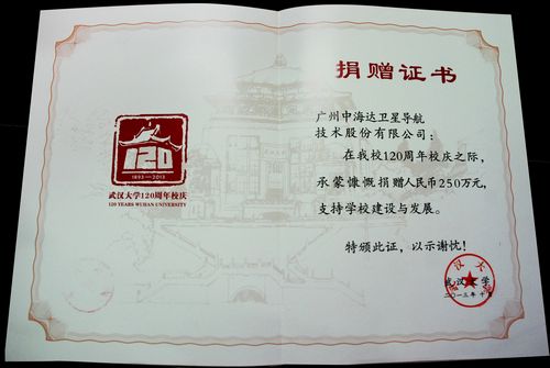 近日,广州中海达卫星导航技术股份有限公司在武汉大学120周年校庆之际,向其捐赠人民币250万元,用于支持学校发展和人才建设。