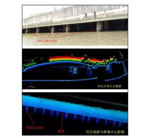 在潮位较低的时候,采用HiScan-STM船载模式,对码头支撑水泥柱进行三维激光扫描,获取其点云数据。
