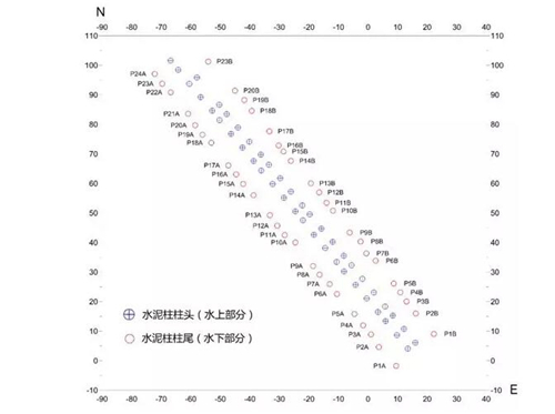 扩建需要对原码头数据进行测量。该码头防波堤由水泥板与水泥支撑柱组成,支撑柱长约30米,呈规则圆柱形。日常水位时支撑柱位于水下,最低潮位时支撑柱露出水面约1.5米。项目最终目标需获得支撑柱的斜率及其柱尾端的位置坐标和高程。