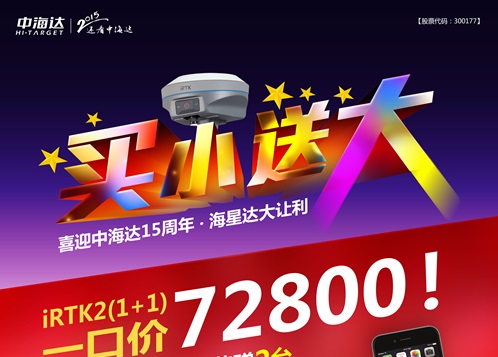 中海达庆贺成立15周年,隆重推出“买小送大·喜迎中海达15周年 海星达大让利”活动,凡购买iRTK2(1+1),即可享受¥72800元优惠,同时赠送2台iphone6 plus!