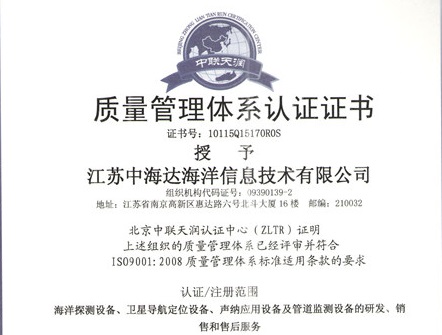 认证范围包括海洋探测设备、卫星导航定位设备、声纳应用设备及管道监测设备的研发、销售及售后服务。